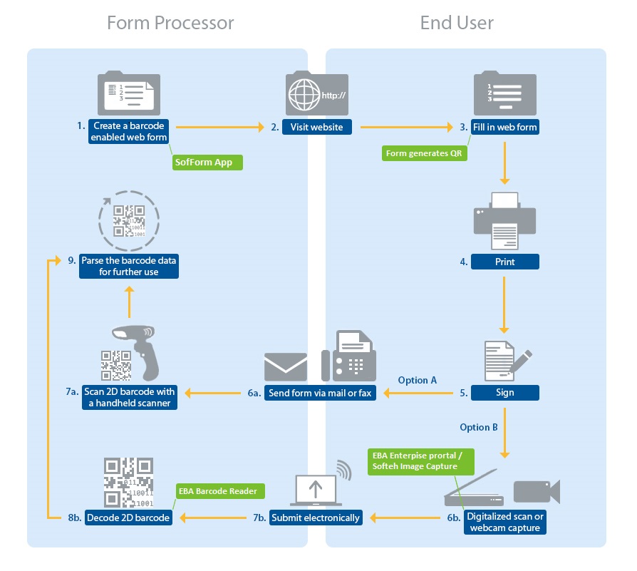 Neposredno po podpisu se lahko natisnjen dokument nemudoma posreduje podjetju v obravnavo po elektronski poti ali pa s pomočjo klasične analogne pošte. Podatki iz obrazca oz. vloge se tako v celoti zapišejo v 2D črtno kodo – QR koda. Končni uporabnik s tem nima dodatnega dela, a hkrati poenostavi in pospeši njeno obdelavo.